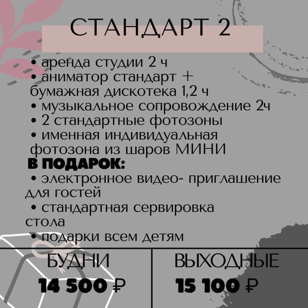 Стандарт- программа для детей, рассчитанная на 2 часа аренды, с различным наполнением, дополнительными услугами и оформлением. Дополнительно предлагаем бонусы, которые могут быть только в Пин Ап видео-приглашение, сервировка стола, подарки всем гостям (детям), подарки имениннику и др.