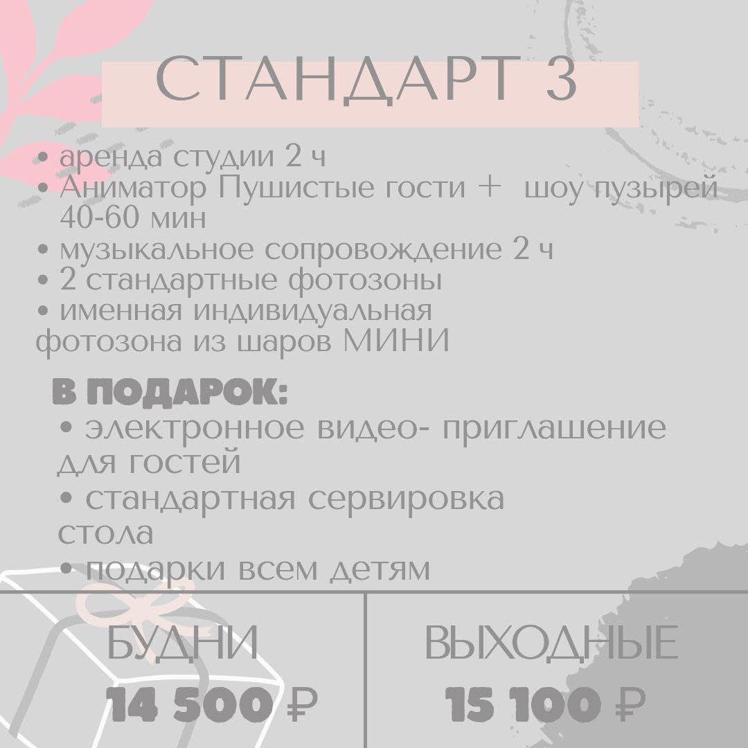Стандарт - программа для детей, рассчитанная на 2 часа аренды, с различным наполнением, дополнительными услугами и оформлением. Дополнительно предлагаем Пин Ап которые могут быть только в пакетах: видео-приглашение, сервировка стола, подарки всем гостям (детям), подарки имениннику и др.