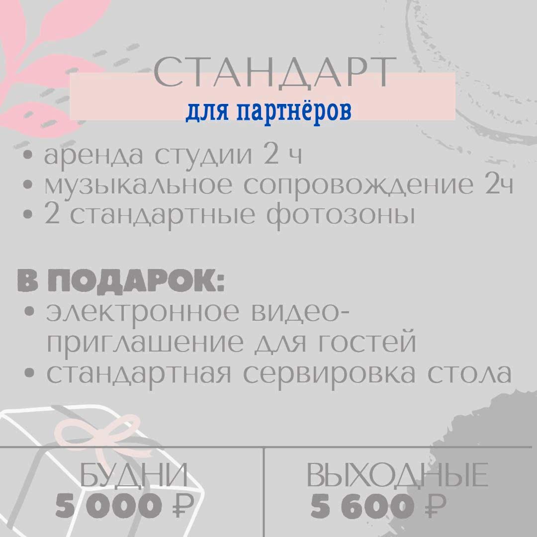 Стандарт для партнеров - программа для детей, рассчитанная на 2 часа аренды, с Пин Ап наполнением, дополнительными услугами и оформлением. Дополнительно предлагаем бонусы, которые могут быть только в пакетах: видео-приглашение, сервировка стола.